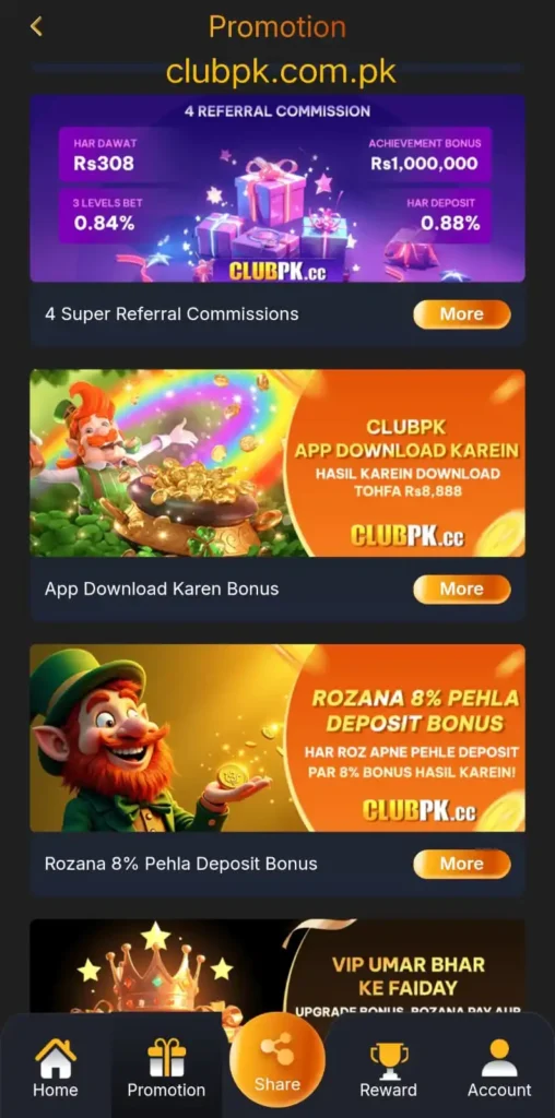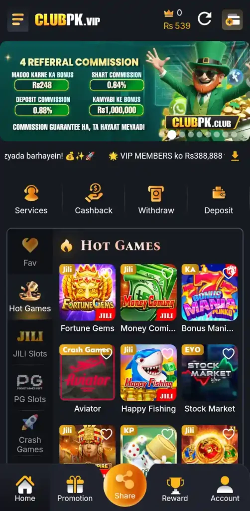 Club PK Game is a popular online gaming and earning app designed for users in Pakistan. It offers a wide range of casino-style games such as Teen Patti, Andar Bahar, slots, and roulette, allowing players to earn real money through gameplay, bonuses, and referrals.
